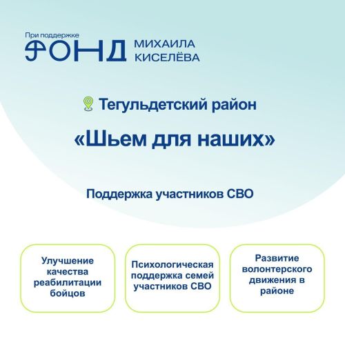 К данному виду производства планируется привлечение членов семей участников специальной военной операции, проживающих на территории Тегульдетского района и волонтеров из числа тех, кто уже плетет маскировочные сети «Плетем победу», тех, кто шьет госпитальные трусы и изготавливает сухие супы «За НАШИХ».